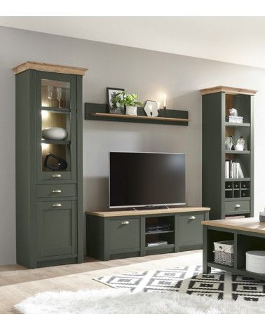 Mueble de TV MIDDLETON, de estilo rústico moderno que destaca por su original y elegante color verde inglés y detalles decorativos que lo convierten en una pieza única.